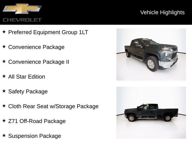 Certified. Shadow Gray Metallic 2020 Chevrolet Silverado 2500HD LT 4WD 10-Speed Automatic Duramax 6.6L V8 Turbodiesel Silverado 2500HD LT, 4D Crew Cab, Duramax 6.6L V8 Turbodiesel, 10-Speed Automatic, 4WD, Shadow Gray Metallic, Black Cloth, 10-Way Power Driver Seat Adjuster w/Lumbar, 12-Volt Rear Auxiliary Power Outlet, 120-Volt Bed Mounted Power Outlet, 120-Volt Instrument Panel Power Outlet, 170 Amp Alternator, 2 USB Ports (1st Row), 2 USB Ports & 1 SD Card Reader (1st Row), 2-Speed Electronic Shift Transfer Case, 4-Way Manual Driver Seat Adjuster, 4.2 Diagonal Color Display DIC, 4G LTE Wi-Fi Hotspot Capable, 5th Wheel & Gooseneck Trailer Wiring Provisions, 6-Speaker Audio System, Advanced Trailering System, All Star Edition, Apple CarPlay/Android Auto, Black Mirror Caps, Bluetooth® For Phone, Chevrolet Connected Access Capable, Chrome Front Grille, Cloth Rear Seat w/Storage Package, Color-Keyed Carpeting Floor Covering, Compass, Convenience Package, Convenience Package II, Deep-Tinted Glass, Dual Charge-Only USB Ports (2nd Row), Dual-Zone Automatic Climate Control, Electric Rear-Window Defogger, Electrical Lock Control Steering Column, Electronic Cruise Control w/Set & Resume Speed, Engine Block Heater, Exhaust Brake, Exterior Parking Camera Rear, Front LED Fog Lamps, Front Rubberized Vinyl Floor Mats, HD Radio, HD Rear Vision Camera, Heated Driver & Front Outboard Passenger Seating, Heated Steering Wheel, Heated Vertical Trailering Mirrors, Hill Descent Control, Hitch Guidance w/Hitch View, Integrated Trailer Brake Controller, Keyless Open & Start, Lane Change Alert w/Side Blind Zone Alert, Leather-Wrapped Steering Wheel, Locking Tailgate, Manual Tailgate Function w/EZ Lift (QT3), Manual Tilt & Telescoping Steering Column, Manual Tilt-Wheel Steering Column, Off-Road Suspension, OnStar & Chevrolet Connected Services Capable, Power Door Locks, Power Front Windows w/Driver Express Up/Down, Power Front Windows w/Passenger Express Down, Power Rear Windows w/Express Down, Power Sliding Rear Window w/Defogger, Preferred Equipment Group 1LT, Radio: Chevrolet Infotainment 3 Plus System, Rear 60/40 Folding Bench Seat (Folds Up), Rear Cross Traffic Alert, Rear Rubberized Vinyl Floor Mats, Rear Vision Camera, Remote Keyless Entry, Remote Vehicle Starter System, Safety Package, SiriusXM w/360L, Steering Wheel Audio Controls, Suspension Package, Ultrasonic Front & Rear Park Assist, Unauthorized Entry Theft-Deterrent System, Universal Home Remote, Urethane Steering Wheel, Wheels: 18 Machined Alum w/Silver Painted Accents, Z71 Off-Road Package.