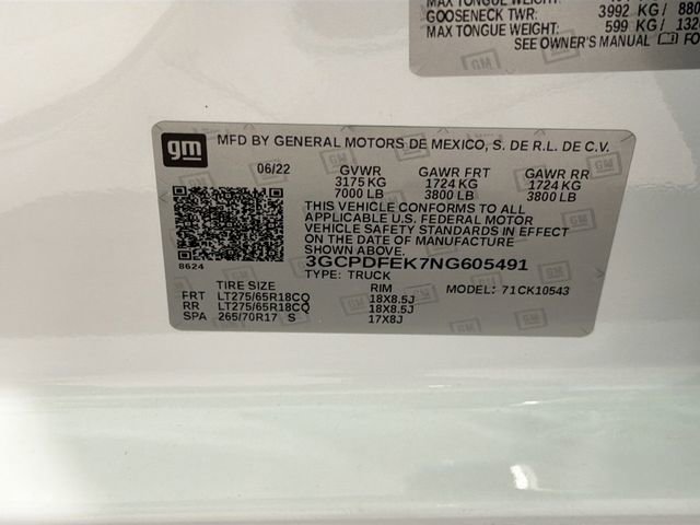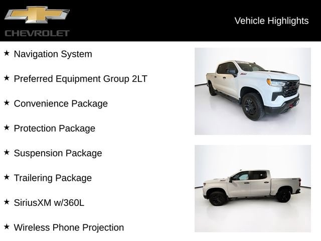 Certified. CARFAX One-Owner. Summit White 2022 Chevrolet Silverado 1500 LT Trail Boss 4WD 8-Speed Automatic 2.7L Turbo Silverado 1500 LT Trail Boss, 4D Crew Cab, 2.7L Turbo, 8-Speed Automatic, 4WD, Summit White, Jet Black Cloth, 10-Way Power Driver Seat w/Lumbar, 12.3 Multicolor Reconfigurable Digital Display, 120-Volt Bed Mounted Power Outlet, 120-Volt Instrument Panel Power Outlet, 6-Speaker Audio System, All-Weather Floor Liner (LPO) (AAK), Apple CarPlay/Android Auto, Auto-Locking Rear Differential, Bluetooth® For Phone, Chevrolet Connected Access Capable, Chevytec Spray-On Black Bedliner, Color-Keyed Carpeting Floor Covering, Compass, Convenience Package, Deep-Tinted Glass, Dual Rear USB Ports (Charge Only), Dual-Zone Automatic Climate Control, Electric Rear-Window Defogger, Electrical Steering Column Lock, Electronic Cruise Control, EZ Lift Power Lock & Release Tailgate, Front LED Fog Lamps, HD Rear Vision Camera, Heated Driver & Front Outboard Passenger Seats, Heated front seats, Heated Power-Adjustable Outside Mirrors, Heated Steering Wheel, Heavy-Duty Air Filter, High Gloss Black Mirror Caps, Hill Descent Control, Hitch Guidance, Inside Rear-View Mirror w/Tilt, Keyless Open & Start, Leather Wrapped Steering Wheel, LED Cargo Area Lighting, Manual Tilt/Telescoping Steering Column, Navigation System, OnStar & Chevrolet Connected Services Capable, Performance Red Recovery Hooks, Power Front Windows w/Driver Express Up/Down, Power Front Windows w/Passenger Express Down, Power Rear Windows w/Express Down, Preferred Equipment Group 2LT, Premium audio system: Chevrolet Infotainment 3 Premium, Protection Package, Rear 60/40 Folding Bench Seat (Folds Up), Rear Wheelhouse Liners, Remote Vehicle Starter System, SiriusXM w/360L, Standard Tailgate, Steering Wheel Audio Controls, Suspension Package, Theft Deterrent System (Unauthorized Entry), Trailering Package, Wheels: 18 x 8.5 Black Painted Aluminum, Wi-Fi Hot Spot Capable, Wireless Phone Projection.