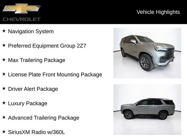 Certified. Sterling Gray Metallic 2023 Chevrolet Tahoe Z71 4WD 10-Speed Automatic with Overdrive EcoTec3 5.3L V8 Tahoe Z71, 4D Sport Utility, EcoTec3 5.3L V8, 10-Speed Automatic with Overdrive, 4WD, Sterling Gray Metallic, Black Leather, 10-Way Power Driver & Passenger Seat Adjusters, 1st & 2nd Row Color-Keyed Carpeted Floor Mats, 2-Speed Active Electronic AutoTrac Transfer Case, 2nd Row Pwr Release 60/40 Split-Folding Bench Seat, 3rd Row 60/40 Power-Folding Split-Bench Seat, 3rd row seats: split-bench, Advanced Trailering Package, Apple CarPlay/Android Auto, Auto-Dimming Inside Rear-View Mirror, Black Tubular Assist Steps, Bose 9-Speaker Stereo Audio System Feature, Bright Front & Rear Door Sill Plates, Color-Keyed Carpeting Floor Covering, Driver & Front Outboard Passenger Airbags, Driver Alert Package, Dual-Pane Power Panoramic Sunroof, Enhanced Driver Information Center, Extra Capacity Cooling System, Floor Console w/Storage Area, Front dual zone A/C, Front High-Approach Angle Fascia, Hands-Free Rear Power Programmable Liftgate, HD Surround Vision, Heated 2nd Row Outboard Seats, Heated Driver & Front Passenger Seats, Heated Steering Wheel, Hill Descent Control, Hitch Guidance w/Hitch View, Infotainment Display, Integrated Trailer Brake Controller, Lane Change Alert w/Side Blind Zone Alert, Leather-Appointed Seat Trim, LED Daytime Running Lamps, License Plate Front Mounting Package, Luxury Package, Max Trailering Package, Memory Settings, Memory Settings for Driver, Navigation System, Outside Heated Power-Adjustable Mirrors, Power Liftgate, Power Release 2nd Row Bucket Seats, Power Tilt & Telescopic Steering Column, Preferred Equipment Group 2Z7, Premium Smooth Ride Suspension, Rear Cross Traffic Alert, Rear Pedestrian Alert, Red Horizontal-Mounted Recovery Hooks, Remote Start, SiriusXM Radio w/360L, Smart Trailer Integration Indicator, Speed control, Split folding rear seat, Universal Home Remote, Wheels: 20 x 9 Machined Aluminum, Wireless Charging, Wrapped Steering Wheel.