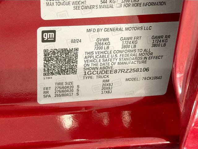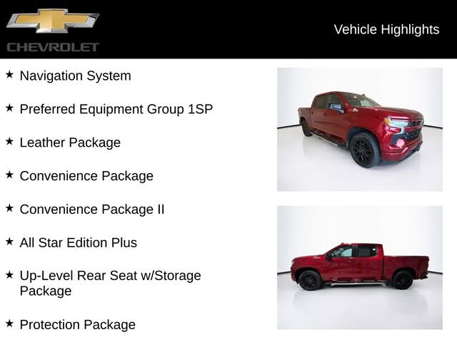 Certified. CARFAX One-Owner. Radiant Red Tintcoat 2024 Chevrolet Silverado 1500 RST 4WD 10-Speed Automatic 3.0L I6 Silverado 1500 RST, 4D Crew Cab, 3.0L I6, 10-Speed Automatic, 4WD, Radiant Red Tintcoat, Black Leather, 10-Way Power Driver Seat w/Lumbar, 12.3 Multicolor Reconfigurable Digital Display, 120-Volt Bed Mounted Power Outlet, 120-Volt Interior Power Outlet, 6-Speaker Audio System, All Star Edition Plus, All-Star Edition, Auto-Locking Rear Differential, Automatic Emergency Braking, Bluetooth® For Phone, Chevrolet Connected Access Capable, Chevytec Spray-On Black Bedliner, Color-Keyed Carpeting Floor Covering, Convenience Package, Convenience Package II, Deep-Tinted Glass, Dual Exhaust w/Polished Outlets, Dual Rear USB Ports (Charge Only), Dual-Zone Automatic Climate Control, Electric Rear-Window Defogger, Electrical Steering Column Lock, Electronic Cruise Control, Engine Block Heater, EZ Lift Power Lock & Release Tailgate, Front fog lights, Front Frame-Mounted Black Recovery Hooks, Front LED Fog Lamps, Front Rubberized Vinyl Floor Mats, HD Rear Vision Camera, Heated Driver & Front Outboard Passenger Seats, Heated Power-Adjustable Outside Mirrors, Heated Steering Wheel, Heated steering wheel, Heavy-Duty Air Filter, High Capacity Suspension Package, High Gloss Black Mirror Caps, Hill Descent Control, Hitch Guidance, Hitch Guidance w/Hitch View, In-Vehicle Trailering System App, Inside Rear-View Mirror w/Tilt, Integrated Trailer Brake Controller, Keyless Open & Start, Leather Package, Leather-Appointed Front Seat Trim, LED Cargo Area Lighting, Navigation System, Off-Road Suspension, OnStar & Chevrolet Connected Services Capable, Power Front Windows w/Driver Express Up/Down, Power Front Windows w/Passenger Express Down, Power Rear Windows w/Express Down, Power Sliding Rear Window w/Rear Defogger, Preferred Equipment Group 1SP, Premium Bose 7-Speaker Sound System, Protection Package, Rear 60/40 Folding Bench Seat (Folds Up), Rear Rubberized-Vinyl Floor Mats, Rear Wheelhouse Liners, Remote Vehicle Starter System, SiriusXM w/360L, Standard Suspension Package, Standard Tailgate, Steering Wheel Audio Controls, Theft Deterrent System (Unauthorized Entry), Trailering Package, Universal Home Remote, Up-Level Rear Seat w/Storage Package, Wheels: 20 x 9 High Gloss Black Painted Alum, Wheels: 20 x 9 Painted Aluminum, Wi-Fi Hot Spot Capable, Wrapped Steering Wheel, Z71 Off-Road Package.