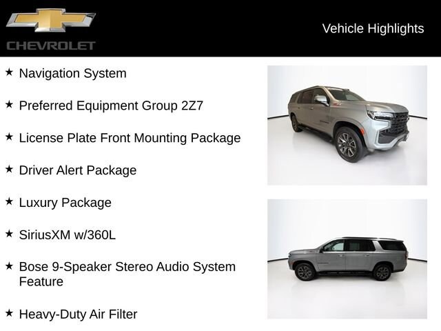 CARFAX One-Owner. Sterling Gray Metallic 2024 Chevrolet Suburban Z71 4WD 10-Speed Automatic with Overdrive EcoTec3 5.3L V8 Suburban Z71, 4D Sport Utility, EcoTec3 5.3L V8, 10-Speed Automatic with Overdrive, 4WD, Sterling Gray Metallic, Black Leather, 10-Way Power Driver & Passenger Seat Adjusters, 1st & 2nd Row Color-Keyed Carpeted Floor Mats, 2-Speed Active Electronic AutoTrac Transfer Case, 2nd Row Pwr Release 60/40 Split-Folding Bench Seat, 3rd Row 60/40 Power-Folding Split-Bench, Apple CarPlay/Android Auto, Auto-Dimming Inside Rear-View Mirror, Black Tubular Assist Steps, Bose 9-Speaker Stereo Audio System Feature, Bright Front & Rear Door Sill Plates, Color-Keyed Carpeting Floor Covering, Driver & Front Outboard Passenger Airbags, Driver Alert Package, Dual-Pane Power Panoramic Sunroof, Enhanced Driver Information Center, Floor Console w/Storage Area, Four wheel independent suspension, Front High-Approach Angle Fascia, Hands-Free Rear Power Programmable Liftgate, HD Surround Vision, Heated 2nd Row Outboard Seats, Heated Driver & Front Passenger Seats, Heated Steering Wheel, Heavy-Duty Air Filter, Hill Descent Control, Infotainment Display, Lane Change Alert w/Side Blind Zone Alert, LED Daytime Running Lamps, License Plate Front Mounting Package, Luxury Package, Memory Settings, Memory Settings For Driver, Navigation System, Outside Heated Power-Adjustable Mirrors, Power Liftgate, Power Tilt & Telescopic Steering Column, Preferred Equipment Group 2Z7, Rear Cross Traffic Alert, Rear Pedestrian Alert, Red Recovery Hooks, Remote Start, SiriusXM w/360L, Universal Home Remote, Wheels: 20 x 9 Machined Aluminum, Wireless Charging, Wrapped Steering Wheel.