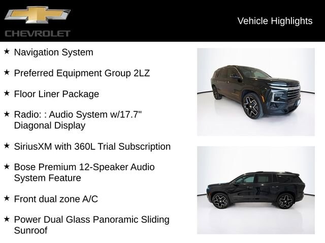 CARFAX One-Owner. Black Metallic 2026 Chevrolet Traverse High Country AWD 8-Speed Automatic 2.5L DOHC Traverse High Country, 4D Sport Utility, 2.5L DOHC, 8-Speed Automatic, AWD, Black Metallic, High Country Jet Black With Bronze Accents Leather, 1st and 2nd Row All-Weather Floor Liners, 3rd Row All-Weather Floor Liner, 3rd row seats: split-bench, Apple CarPlay/Android Auto, Bose Premium 12-Speaker Audio System Feature, Driver 4-Way Power Lumbar Seat Adjuster, Exterior Parking Camera Rear, Floor Liner Package, Front dual zone A/C, Front Passenger 4-Way Power Lumbar Seat Adjuster, Heated front seats, Heated steering wheel, Integrated Cargo Liner, Navigation System, Power Dual Glass Panoramic Sliding Sunroof, Power Liftgate, Preferred Equipment Group 2LZ, Radio: : Audio System w/17.7 Diagonal Display, SiriusXM with 360L Trial Subscription, Speed control, Spoiler, Ventilated Driver and Front Passenger Seats, Ventilated front seats, Wheels: 22 High-Gloss Black Aluminum.