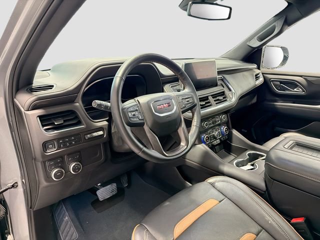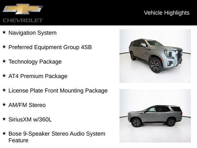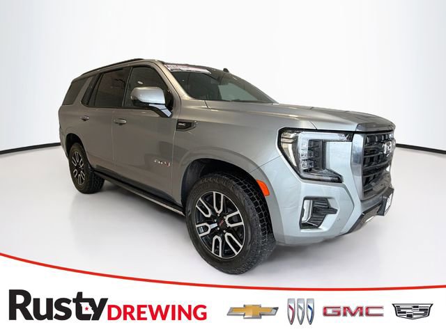 Certified. CARFAX One-Owner. Sterling Metallic 2024 GMC Yukon AT4 4WD 10-Speed Automatic with Overdrive EcoTec3 5.3L V8 Yukon AT4, 4D Sport Utility, EcoTec3 5.3L V8, 10-Speed Automatic with Overdrive, 4WD, Sterling Metallic, Black Leather, 12-Way Power Seat Adjusters, 15 Diagonal Multi-Color Head-Up Display, 2 Presets For Outside Rearview Mirrors, 3rd Row 60/40 Power-Folding Split-Bench Seat, 3rd row seats: split-bench, AM/FM Stereo, Apple CarPlay/Android Auto, AT4 Premium Package, Black Roof-Mounted Luggage Rack Side Rails, Bose 9-Speaker Stereo Audio System Feature, Bright Front & Rear Door Sill Plates, Dual-Pane Panoramic Power Sunroof, Following Distance Indicator, Forward Collision Alert, Front & Rear Park Assist, Front dual zone A/C, Front High-Approach Angle Fascia, Front Pedestrian Braking, Hands-Free Power Programmable Rear Liftgate, HD Surround Vision, Heated 2nd Row Outboard Position Seats, Heated Driver & Front Passenger Seats, Heated Steering Wheel, Heavy-Duty Air Filter, Hill Descent Control, Inside Rear-View Auto-Dimming Mirror, License Plate Front Mounting Package, Navigation System, Outside Heated Power-Adjustable Mirrors, Perforated Heated & Ventilated Dr & Frt Pass Seats, Power Liftgate, Power Release 2nd Row 60/40 Split-Folding Bench Seat, Power Tilt & Telescopic Steering Column, Power-Retractable Assist Steps, Preferred Equipment Group 4SB, Rear Pedestrian Alert, Red Horizontal-Mounted Recovery Hooks, Safety Alert Seat, SiriusXM w/360L, Steering wheel memory, Steering wheel mounted audio controls, Technology Package, Universal Home Remote, Ventilated front seats, Wheels: 20 x 9 6-Spoke Machined Aluminum, Wireless Charging.