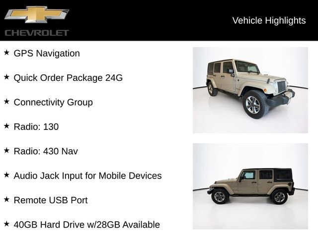 Certified. Gobi Clearcoat 2018 Jeep Wrangler JK Unlimited Sahara 4WD 5-Speed Automatic 3.6L V6 24V VVT Wrangler JK Unlimited Sahara, 4D Sport Utility, 3.6L V6 24V VVT, 4WD, Gobi Clearcoat, Black w/Cloth Seats w/Adjustable Head Restraints, 18 x 7.5 Polished Satin Carbon Wheels, 40GB Hard Drive w/28GB Available, 5-Year SiriusXM Travel Link Service, 6.5 Touchscreen Display, AM/FM radio: SiriusXM, Audio Jack Input for Mobile Devices, Body Color Appliques Front Bumper, Body Color Appliques Rear Bumper, Body Color/Accent Color Grille, Cloth Seats w/Adjustable Head Restraints, Connectivity Group, GPS Navigation, Heavy Duty Suspension w/Gas Shocks, Quick Order Package 24G, Radio: 130, Radio: 430 Nav, Remote Start System, Remote USB Port, SiriusXM Travel Link, Tire Pressure Monitoring Display, Uconnect Voice Command w/Bluetooth, Vehicle Information Center.Certification Program Details: CarBravo Certified Awards:* 2018 KBB.com 10 Most Awarded BrandsWelcome to Rusty Drewing Automotive. As your mid-Missouri locally and family owned dealer, excellent customer service is always our #1 priority. Whether you're from Jefferson City or Columbia, MO, from start to finish, we'll make sure your visit to Rusty Drewing Automotive is the best car-buying experience.