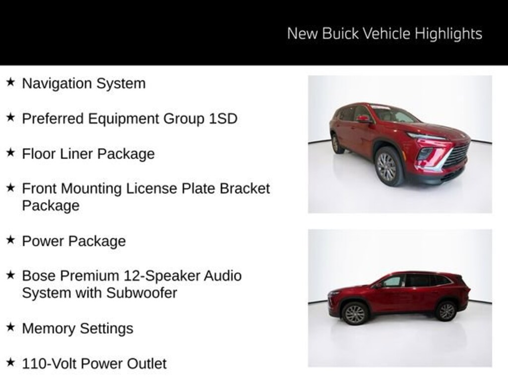 Cherry Red 2026 Buick Enclave Preferred FWD 8-Speed Automatic 2.5L DOHC Enclave Preferred, 4D Sport Utility, 2.5L DOHC, 8-Speed Automatic, FWD, Cherry Red, Sandstone With Ebony Interior Accents Premium Synthetic, 110-Volt Power Outlet, 1st and 2nd Row All-Weather Floor Liners, 2nd Row 1-Touch Flat Folding Seat, 3rd Row 60/40 Power Split-Folding Bench Seat, 3rd Row All-Weather Floor Liner, Bose Premium 12-Speaker Audio System with Subwoofer, Floor Liner Package, Front Mounting License Plate Bracket Package, Head-Up Display, Heated front seats, Heated Wiper Park, Inside Rearview Auo-Dimming Rear Camera Mirror, Integrated Cargo Liner, Memory Settings, Navigation System, Power Liftgate, Power Package, Preferred Equipment Group 1SD, Universal Home Remote. Price includes: $1500 - GM Bonus Cash. Exp. 03/02/2026 $500 - Buick & GMC Consumer Cash Program. Exp. 03/02/2026