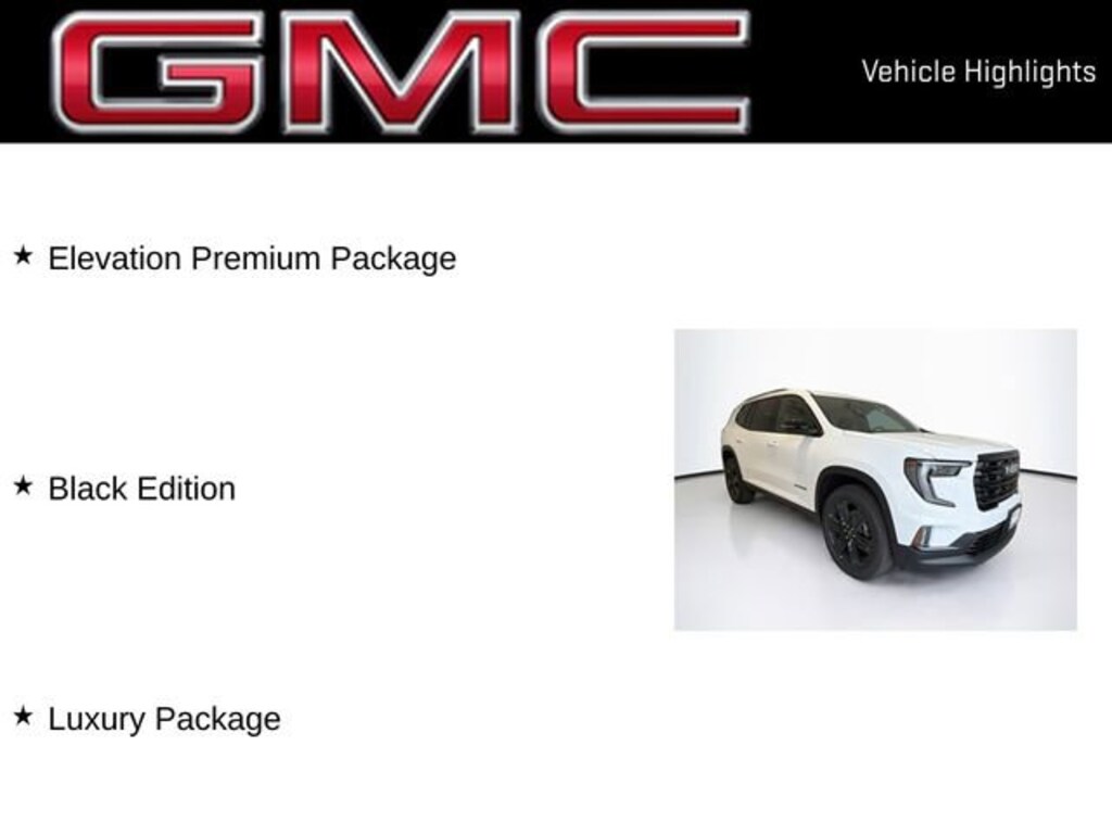 Summit White 2026 GMC Acadia Elevation AWD 8-Speed Automatic 2.5L DOHC Acadia Elevation, 4D Sport Utility, 2.5L DOHC, 8-Speed Automatic, AWD, Summit White, After Dark Cloth, 3-Channel Programmable Universal Home Remote, 6-Way Power Front Passenger Seat Adjuster, 7-Passenger Seating (2-2-3 Seating Configuration), 8 Diagonal Head-Up Display, Black Edition, Bose Premium 12-Speaker System w/Sub-Woofer, CoreTec Seat Trim, Elevation Premium Package, Exterior Parking Camera Rear, Front & Rear Black GMC Emblems (LPO), Front Passenger Power Lumbar Seat Adjuster, Gloss Black Roof Rails, Heated Rear Outboard Seating Positions, Heated steering wheel, Heated Wiper Park, High Gloss Black Door Upper Moldings, Laminated Acoustic Glass, Luxury Package, Navigation System, Power Liftgate, Wheels: 22 x 8.5 Gloss Black Aluminum.