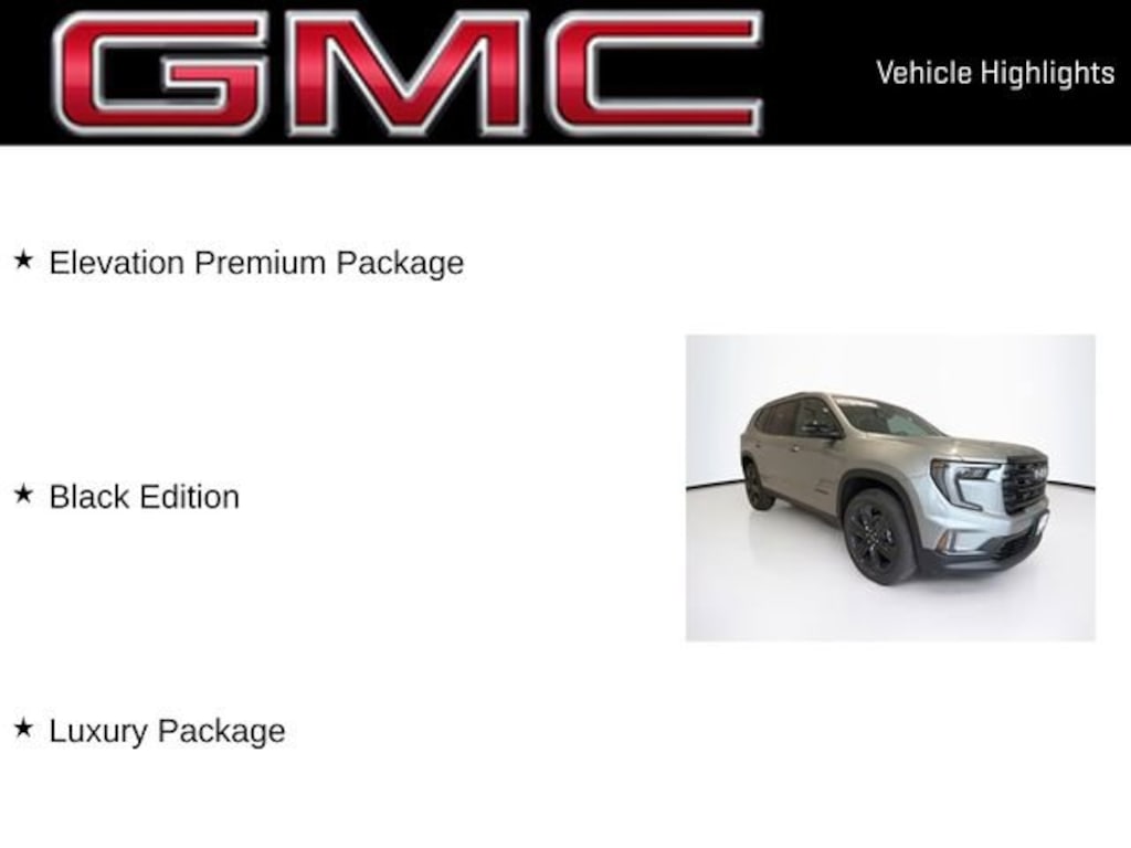Sterling Metallic 2026 GMC Acadia Elevation AWD 8-Speed Automatic 2.5L DOHC Acadia Elevation, 4D Sport Utility, 2.5L DOHC, 8-Speed Automatic, AWD, Sterling Metallic, After Dark Cloth, 3-Channel Programmable Universal Home Remote, 6-Way Power Front Passenger Seat Adjuster, 7-Passenger Seating (2-2-3 Seating Configuration), 8 Diagonal Head-Up Display, Apple CarPlay/Android Auto, Black Edition, Bose Premium 12-Speaker System w/Sub-Woofer, CoreTec Seat Trim, Elevation Premium Package, Exterior Parking Camera Rear, Front & Rear Black GMC Emblems (LPO), Front Passenger Power Lumbar Seat Adjuster, Gloss Black Roof Rails, Heated Rear Outboard Seating Positions, Heated steering wheel, Heated Wiper Park, High Gloss Black Door Upper Moldings, Laminated Acoustic Glass, Luxury Package, Navigation System, Power Liftgate, Wheels: 22 x 8.5 Gloss Black Aluminum.
