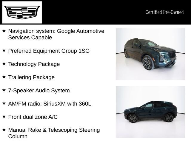 Certified. CARFAX One-Owner. Emerald Lake Metallic 2025 Cadillac XT4 Sport AWD 9-Speed Automatic 2.0L Turbocharged XT4 Sport, 4D Sport Utility, 2.0L Turbocharged, 9-Speed Automatic, AWD, Emerald Lake Metallic, Jet Black With Santorini Blue Accents Leather, 2 Trailer Hitch Receiver, 4-Way Driver Seat Power Lumbar Control, 4-Way Passenger Seat Power Lumbar Control, 6-Way Power Passenger Seat Adjuster, 7-Speaker Audio System, AM/FM radio: SiriusXM with 360L, Apple CarPlay/Android Auto, Auto-Dimming Inside Rear-View Mirror, Front dual zone A/C, Heavy-Duty Cooling System, Inteluxe Seat Trim, Manual Rake & Telescoping Steering Column, Navigation system: Google Automotive Services Capable, Power Liftgate, Power Rake & Telescoping Steering Column, Preferred Equipment Group 1SG, Rear Camera Mirror, Rear Camera Mirror Washer, Reconfigurable Full-Color Head-Up Display, Technology Package, Trailering Package, Wheels: 20 Dynamic Multi-Spoke Alloy, Wireless Apple CarPlay/Wireless Android Auto, Wireless Phone Charging.