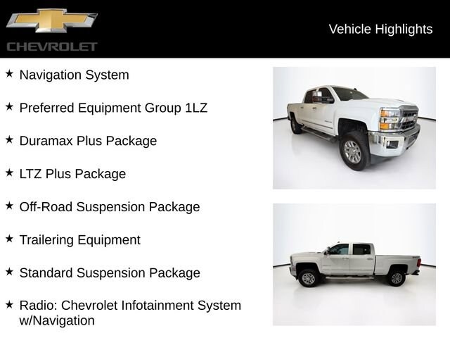 Summit White 2019 Chevrolet Silverado 3500HD LTZ 4WD Allison 1000 6-Speed Automatic Duramax 6.6L V8 Turbodiesel Silverado 3500HD LTZ, 4D Crew Cab, Duramax 6.6L V8 Turbodiesel, Allison 1000 6-Speed Automatic, 4WD, Summit White, Black Leather, 110-Volt AC Power Outlet, 150 Amps Alternator, 3.73 Rear Axle Ratio, 4.2 Diagonal Color Display Driver Info Center, 6-Speaker Audio System, Auto-Dimming Inside Rear-View Mirror, Chevrolet 4G LTE, Chevrolet Connected Access, Chrome Bodyside Moldings, Chrome Door Handles, Chrome Power-Adjustable Heated Outside Mirrors, Color-Keyed Carpeting Floor Covering, Deep-Tinted Glass, Digital Steering Assist, Driver & Front Passenger Visors, Dual-Zone Automatic Climate Control, Duramax Plus Package, Electric Rear-Window Defogger, Electronic Shift Transfer Case, Engine Block Heater, EZ-Lift & Lower Tailgate, Front Halogen Fog Lamps, HD Radio, Hill Descent Control, Leather Wrapped Heated Steering Wheel, Leather-Wrapped Steering Wheel, LTZ Plus Package, Manual Tilt-Wheel/Telescoping Steering Column, Navigation System, Off-Road Suspension Package, OnStar & Chevrolet Connected Services Capable, Power Adjustable Pedals, Power Sliding Rear Window w/Defogger, Power Windows, Preferred Equipment Group 1LZ, Radio: Chevrolet Infotainment System w/Navigation, Rear 60/40 Folding Bench Seat (Folds Up), Rear Wheelhouse Liners, Remote Keyless Entry, Remote Locking Tailgate, Remote Vehicle Starter System, Single-Slot CD/MP3 Player, SiriusXM Radio, Standard Suspension Package, Steering Wheel Audio Controls, Trailering Equipment, Unauthorized Entry Theft-Deterrent System, Universal Home Remote.