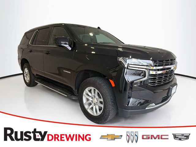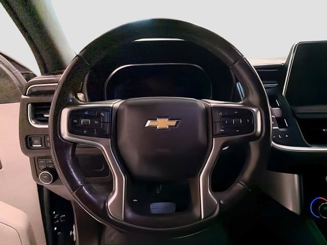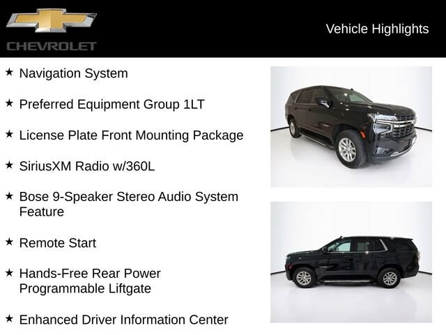 Black 2022 Chevrolet Tahoe LT 4WD 10-Speed Automatic with Overdrive EcoTec3 5.3L V8 Tahoe LT, 4D Sport Utility, EcoTec3 5.3L V8, 10-Speed Automatic with Overdrive, 4WD, Black, Gideon/Very Dark Atmosphere Leather, 10-Way Power Driver & Passenger Seat Adjusters, 1st & 2nd Row Color-Keyed Carpeted Floor Mats, 2nd Row Manual Bucket Seats, 3rd row seats: split-bench, Apple CarPlay/Android Auto, Auto-Dimming Inside Rear-View Mirror, Automatic Stop/Start, Bose 9-Speaker Stereo Audio System Feature, Bright Front & Rear Door Sill Plates, Color-Keyed Carpeting Floor Covering, Driver & Front Outboard Passenger Airbags, Enhanced Driver Information Center, Floor Console w/Storage Area, Hands-Free Rear Power Programmable Liftgate, Heated Driver & Front Passenger Seats, Heated front seats, Infotainment Display, Leather-Wrapped Steering Wheel, LED Daytime Running Lamps, License Plate Front Mounting Package, Memory Settings for Driver, Navigation System, Power Liftgate, Preferred Equipment Group 1LT, Remote Start, SiriusXM Radio w/360L, Start/Stop System Disable Button, Universal Home Remote, Wireless Charging.
