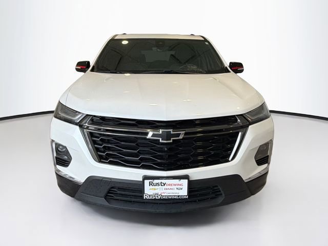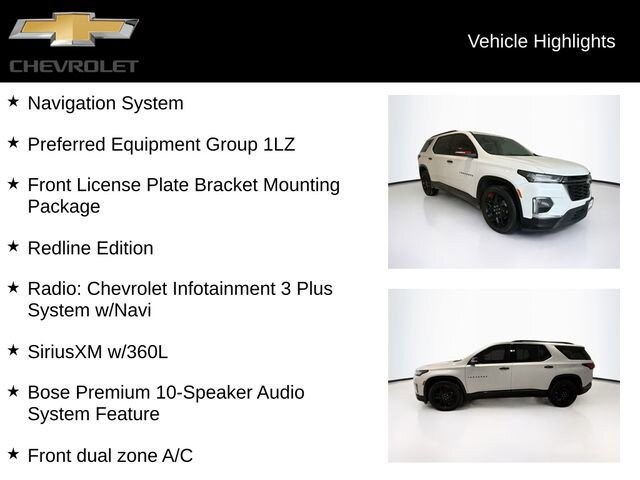 CARFAX One-Owner. Iridescent Pearl Tricoat 2023 Chevrolet Traverse Premier AWD 9-Speed Automatic 3.6L V6 SIDI VVT Traverse Premier, 4D Sport Utility, 3.6L V6 SIDI VVT, 9-Speed Automatic, AWD, Iridescent Pearl Tricoat, Jet Black Leather, 3rd row seats: split-bench, Apple CarPlay/Android Auto, Black Bowtie, Black Door Handles, Black Roof Rails, Bose Premium 10-Speaker Audio System Feature, Dual SkyScape 2-Panel Power Sunroof, Exterior Parking Camera Rear, Front dual zone A/C, Front License Plate Bracket Mounting Package, Heated 2nd Row Outboard Position Seats, Heated Driver & Front Passenger Seats, Heated front seats, Heated rear seats, Heated steering wheel, Navigation System, Ornamentation, Perforated Leather-Appointed Seat Trim, Power Driver Lumbar Control, Power Liftgate, Preferred Equipment Group 1LZ, Radio: Chevrolet Infotainment 3 Plus System w/Navi, Redline Accent Decals (LPO), Redline Edition, SiriusXM w/360L, Ventilated Driver & Front Passenger Seats, Wheels: 20 Gloss Black Painted Alum w/Red Stripes.