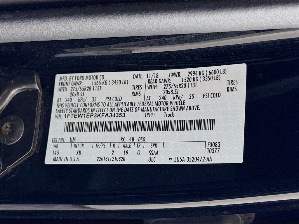 Black 2019 Ford F-150 XLT 4WD 10-Speed Automatic 2.7L V6 EcoBoost Back Up Camera, Moonroof, Heated Seats, F-150 XLT, 4D SuperCrew, 2.7L V6 EcoBoost, 10-Speed Automatic, 4WD, Black, Black w/Unique Special Edition 40/Console/40 Front Seats, 10-Way Power Driver & Passenger Seats, 2-Bar Style Grille w/2 Minor Bars Painted Dark, 2-Bar Style Grille w/Chrome 2 Minor Bars, 4.2" Productivity Screen in Instrument Cluster, 4x4 FX4 Off-Road Bodyside Decal, Accent-Color Step Bars, Auto-Dimming Rear-View Mirror, Black Running Boards, Body-Color Door & Tailgate Handles, Body-Color Front & Rear Bumpers, Body-Color Surround Grille w/Black Mesh Insert, Box Side Decal, Box Side Decals, Chrome Door & Tailgate Handles w/Body-Color Bezel, Chrome Step Bars, Class IV Trailer Hitch Receiver, Cloth 40/20/40 Front Seat, Equipment Group 302A Luxury, Exterior Parking Camera Rear, Fixed Backlight w/Privacy Glass, FX4 Off-Road Package, GVWR: 6,500 lbs Payload Package, GVWR: 6,600 lbs Payload Package, Heated Front Seats, Hill Descent Control, Leather-Wrapped Steering Wheel, LED Box Lighting, Off-Road Tuned Front Shock Absorbers, Power Glass Heated Sideview Mirrors, Power-Adjustable Pedals, Power-Sliding Rear Window, Pro Trailer Backup Assist, Rear Under-Seat Storage, Rear Window Defroster, Remote Start System, Single-Tip Chrome Exhaust, SiriusXM Radio, SYNC 3, Trailer Tow Package, Tray Style Floor Liner, Twin Panel Moonroof, Unique Bodyside & Hood Decals, Upgraded Front Stabilizer Bar, Wheels: 20" Unique Premium Tarnished Dark Painted, XLT Chrome Appearance Package, XLT Power Equipment Group, XLT Special Edition Package, XLT Special Edition Package Graphic Delete, XLT Sport Appearance Package.