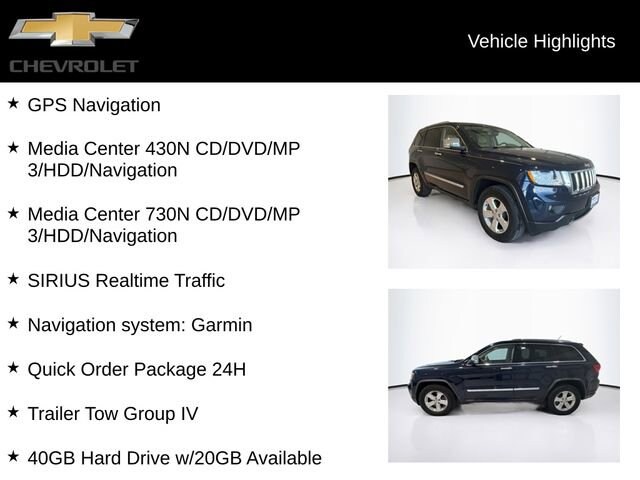 True Blue Pearlcoat 2012 Jeep Grand Cherokee Limited 4WD 6-Speed Automatic 5.7L V8 Multi Displacement VVT Grand Cherokee Limited, 4D Sport Utility, 5.7L V8 Multi Displacement VVT, 6-Speed Automatic, 4WD, True Blue Pearlcoat, Black/Light Frost Beige Leather, 220 Amp Alternator, 40GB Hard Drive w/20GB Available, 7 & 4 Pin Wiring Harness, Auto-dimming Rear-View mirror, Bodyside moldings, Class IV Receiver Hitch, Dual Bright Exhaust Tips, Exterior Parking Camera Rear, Front dual zone A/C, GPS Navigation, Heated front seats, Heavy-Duty Engine Cooling, Media Center 430N CD/DVD/MP3/HDD/Navigation, Media Center 730N CD/DVD/MP3/HDD/Navigation, Navigation system: Garmin, Power moonroof, Premium Leather Trimmed Bucket Seats, Quick Order Package 24H, Rear Load Leveling Suspension, Rear Parking Sensors, Roof rack: rails only, SIRIUS Realtime Traffic, SIRIUSXM Traffic, Trailer Tow Group IV.