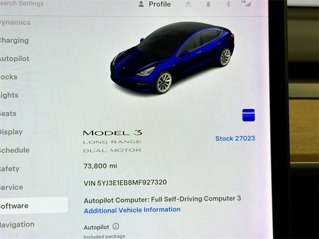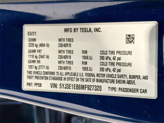 Deep Blue Metallic 2021 Tesla Model 3 Long Range AWD 1-Speed Automatic Electric Motor Model 3 Long Range, 4D Sedan, Electric Motor, 1-Speed Automatic, AWD, Deep Blue Metallic, Black w/Premium Seat Trim, 15 Speakers, Auto-dimming Rear-View mirror, Electronic Stability Control, Exterior Parking Camera Rear, Front Bucket Seats, Front dual zone A/C, Heated front seats, Heated steering wheel, Lane Departure Warning System, Navigation System, Power passenger seat, Speed control, Split folding rear seat, Wheels: 18" x 8.5" Aero.
